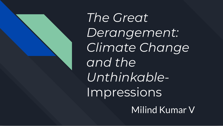 Amitav Ghosh’s book The Great Derangement treats with great literary fervour the pressing issue of climate change. Analyzed through the lens of art and literature, climate change is presented as an elusive problem that fails to find representation in “serious” fiction. Further, the book also acknowledges the centrality of Asia to the discussions surrounding climate justice and a fossil fuel based economy especially in the light of the colonial pasts of some of the most populous nations in the world. Amitav Ghosh also delves into the intricacies of the politics of climate change- the considerations, the challenges and the results. This talk provides a brief overview of some of the key ideas presented in the book.